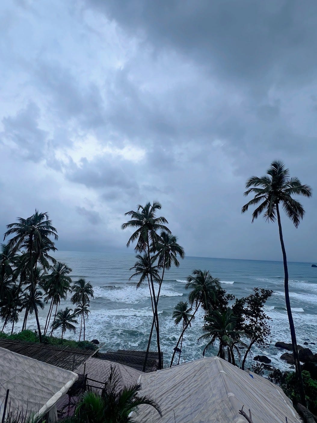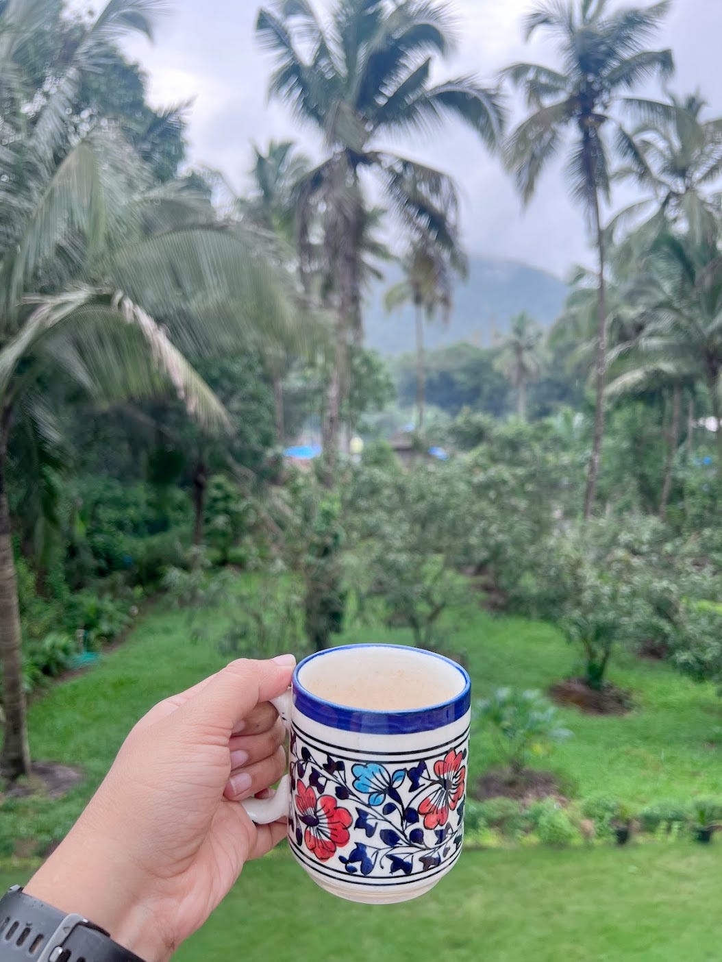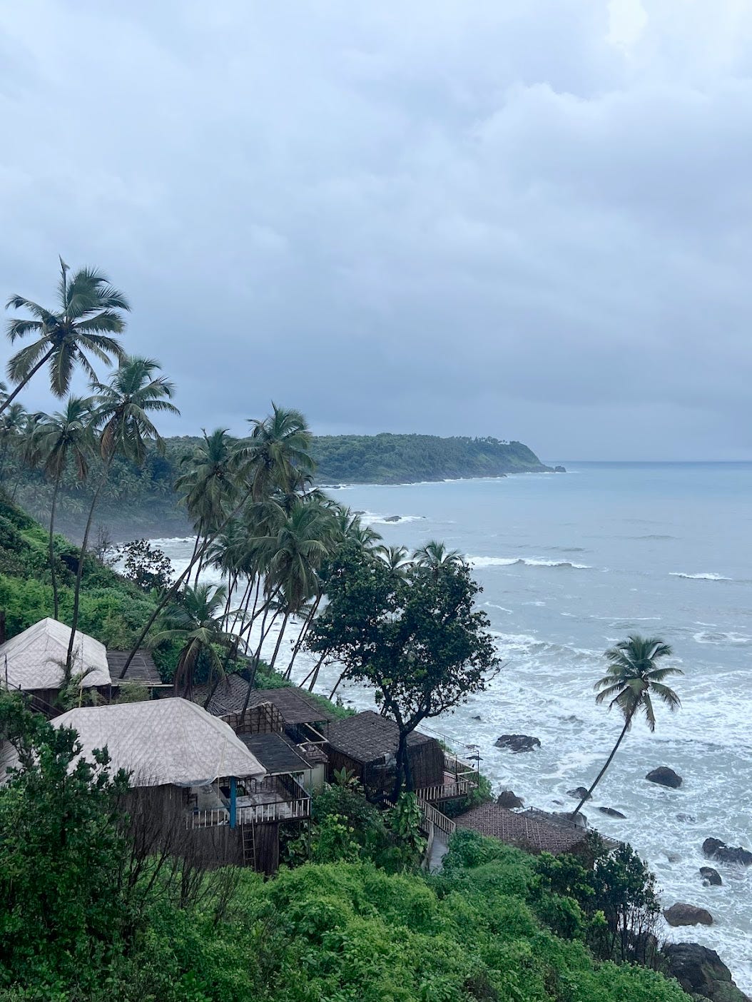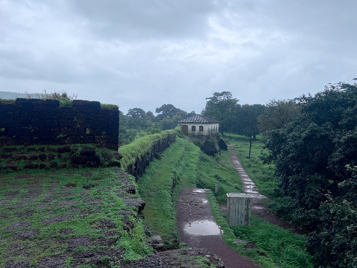 This past weekend, I decided to step out of the house despite the rain. The slippery moss-filled driveway didn’t stop me from putting on my raincoat and driving an hour and a half to Cabo de Rama fort. I had heard about it as a perfect sunset spot, but it was equally delightful in the rain. The feeling of not caring about getting wet––something I loved to do in school––brought back the simple joy of connecting with nature through sensation. Walking down the steep steps to the pebble beach below, and later from wall to wall of the broken ramparts of the fort was exciting. The arched coconut trees with cloudy, grey skies as backdrop looked like a movie still, and the high tide on the beach reminded me how beautiful the sea is, even when it’s rough.